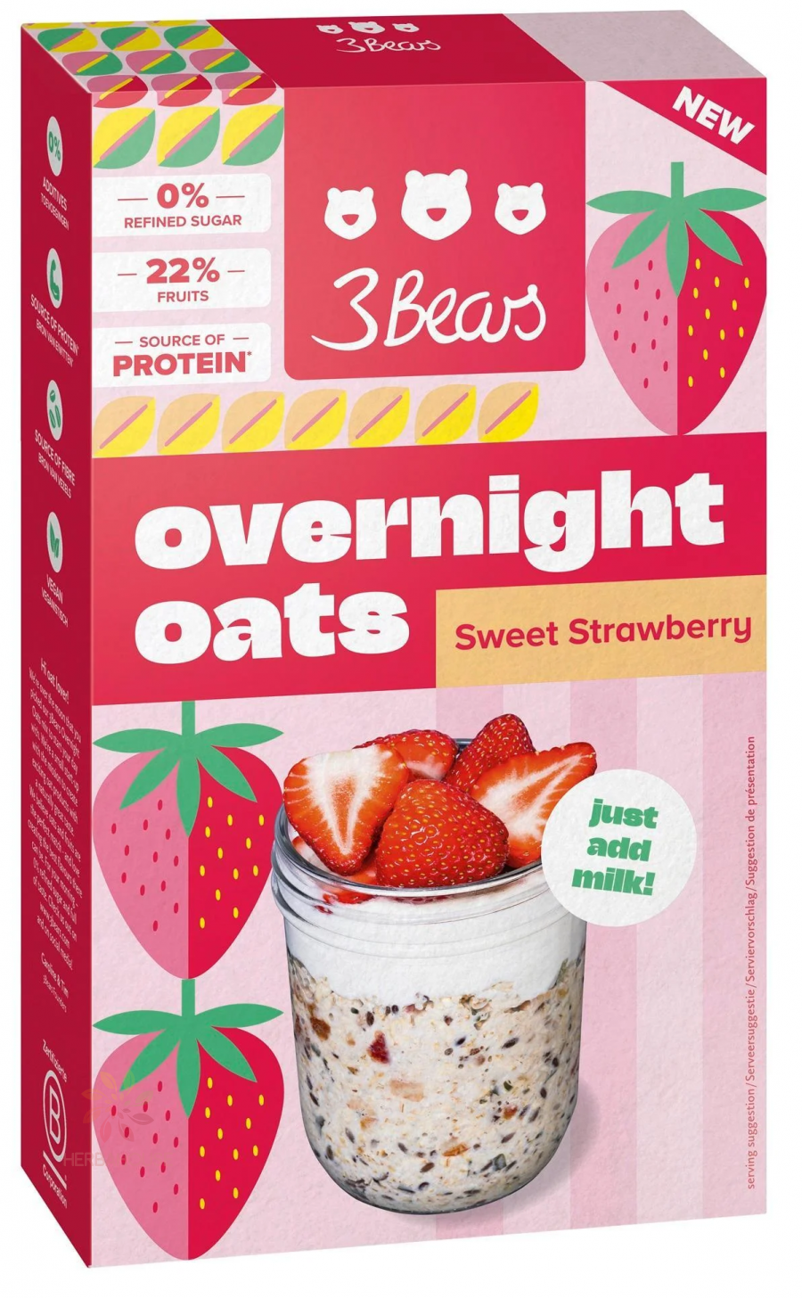 Descoperă o alternativă delicioasă și sănătoasă la desertul clasic cu căpșuni cu fulgii de ovăz 3Bears Overnight Oatmeal – Sweet Strawberry (400g). Acest produs combină ovăz integral, căpșuni aromate, curmale, in și semințe de dovleac pentru a crea un amestec nutritiv, cremos și ușor dulce, ideal pentru micul dejun sau o gustare rapidă. Pur și simplu amestecă fulgii cu apă, lapte sau o băutură pe bază de plante și lasă-i la frigider peste noapte și sunt gata de mâncat – pentru cei care au mai puțin timp, sunt delicioși chiar și după o scurtă perioadă de înmuiere.