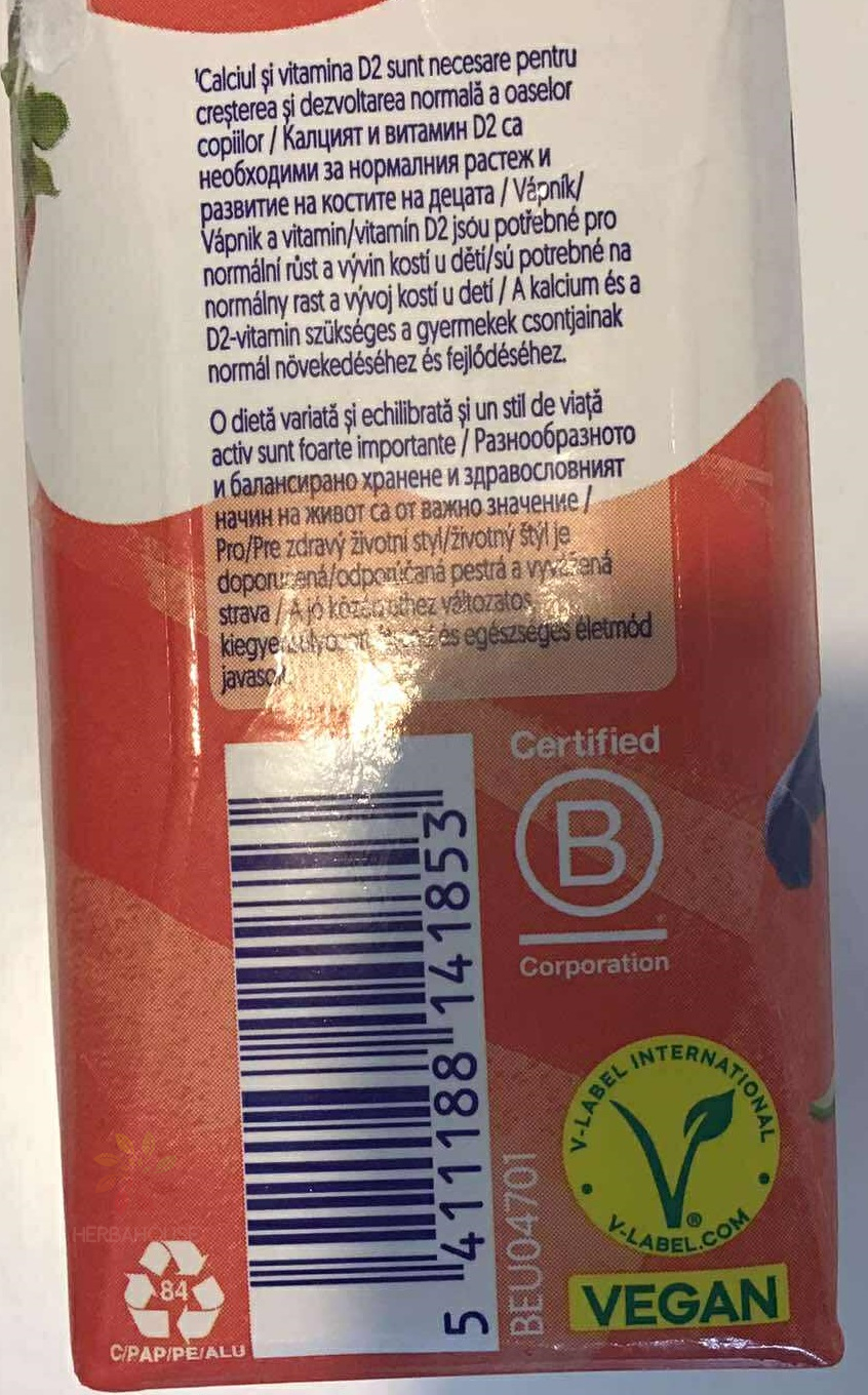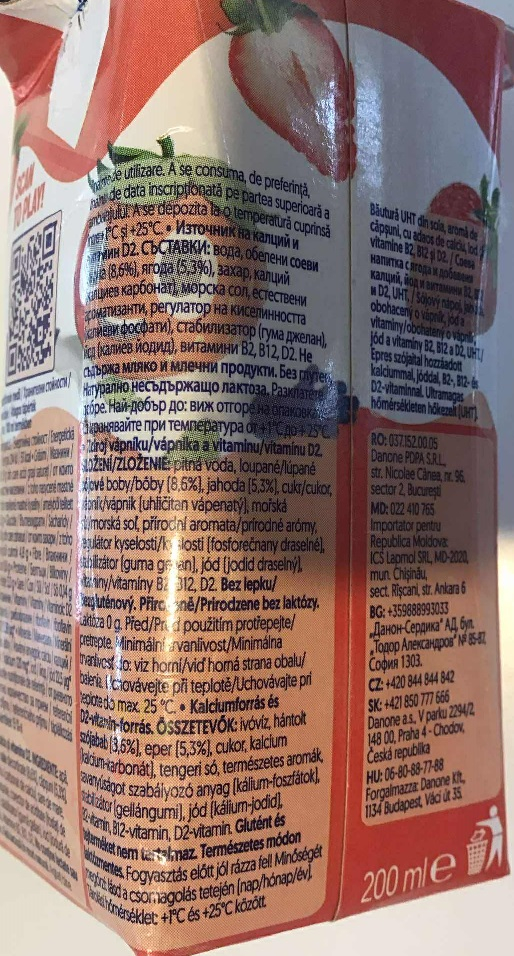 Ingrediente: apă potabilă, boabe de soia decorticate (8,6%), căpșuni (5,3%), zahăr, calciu (carbonat de calciu), sare de mare, arome naturale, regulator de aciditate (fosfați de potasiu), stabilizator (gumă gellan), iod (iodură de potasiu), vitamine (B2, B12, D2).