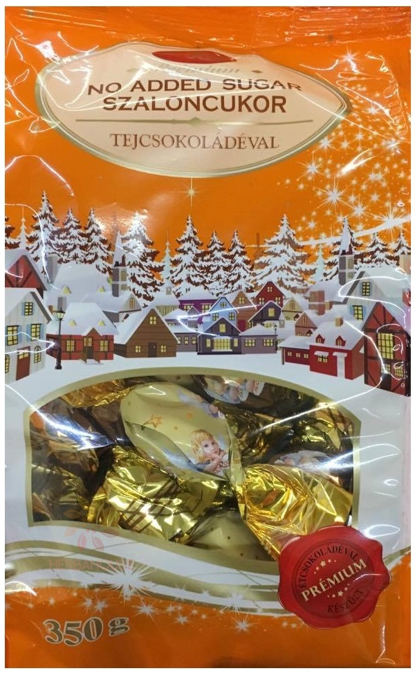Bomboane de Crăciun umplute cu alune de pădure și cremă de lapte, învelite în ciocolată cu lapte fără zahăr adăugat, cu îndulcitori.