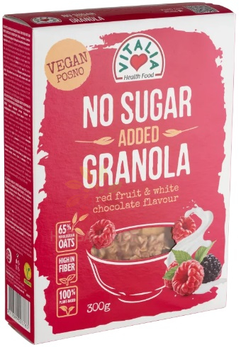Vitalia Vegan Granola cu indulcitori cu fructe rosii si ciocolata alba (300g)